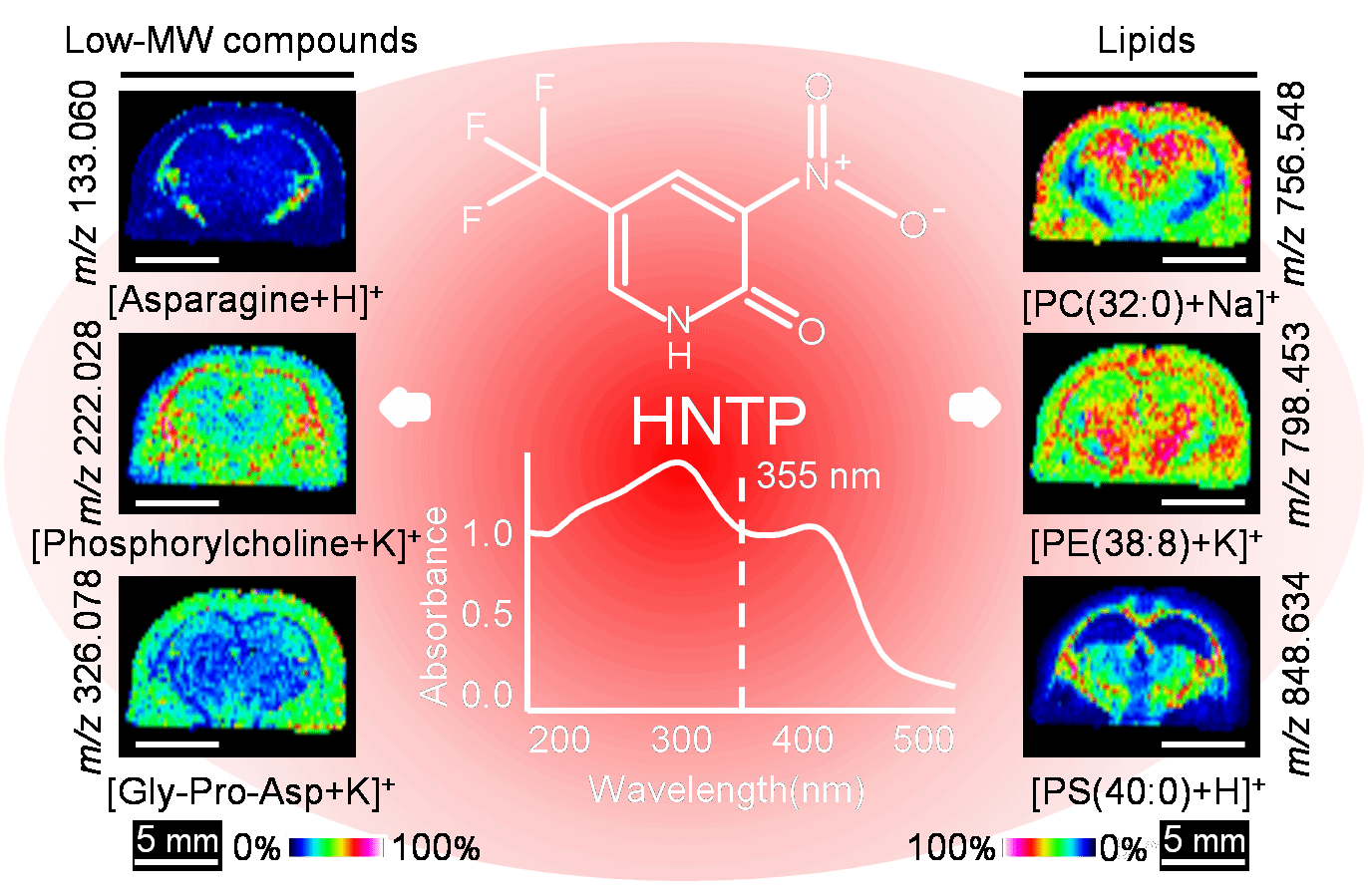 (质谱成像与代谢组学国家民委重点实验室)王晓东教授团队与中国中医科学院西苑医院李琦主任医师团队合作在基质辅助激光解析电离质谱成像 (Matrix-assisted laser desorption/ionization mass spectrometry imaging,MALDI-MSI)内源性代谢物检测与成像表征新型基质研究领域取得了又一重要进展。研究发现利用2‑Hydroxy-5-nitro-3-(trifluoromethyl)pyridine( HNTP)新基质结合MALDI-MSI新型分子成像技术,可成功增强对大鼠脑组织中低分子量化合物(<500 Da)与脂质分子的检测与成像表征,显著优于常规基质2,5-dihydroxybenzoic acid(DHB)和2-mercaptobenzothiazole(2-MBT)。该成果近期作为封面文章发表于高水平国际学术期刊Analytical Chemistry。