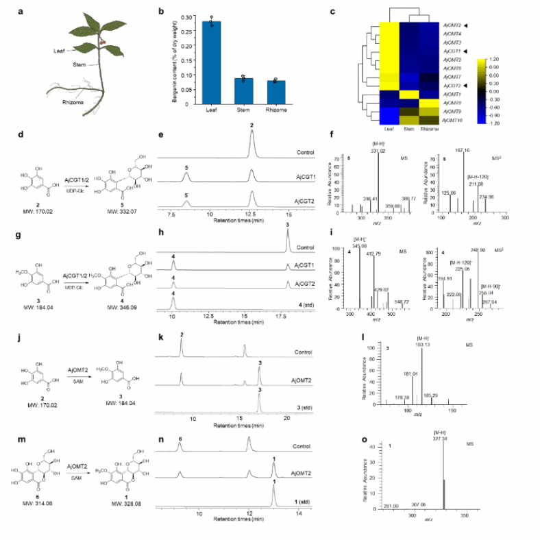 第一,首先解析了岩白菜素的生物合成途径。从含有岩白菜素的药用植物紫金牛(Ardisia japonica)中发掘出催化活性较高的岩白菜素生物合成途径中的关键酶2-C-糖基转移酶AjCGT1和4-O-甲基转移酶AjOMT2(图3),能分别催化各自假设前体形成对应的2-C-糖基化产物、4-O-甲基化产物。酶动力学的研究结果表明,没食子酸在AjOMT2的催化下形成4-O-甲基没食子酸,在AjCGT1的催化下形成4-OMGA-Glc。
