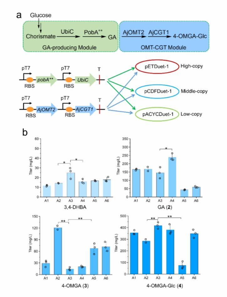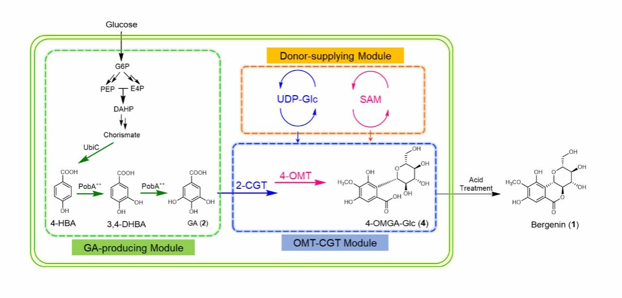 图4.在E. coli中以葡萄糖为碳源从头合成岩白菜素前体4-OMGA-Glc (4)