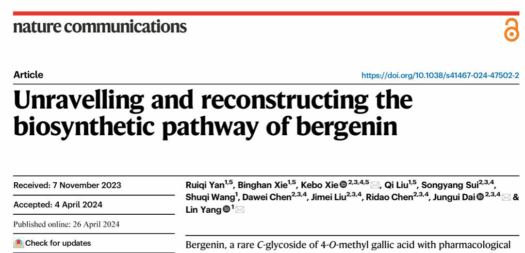 杨林教授团队长期致力于岩白菜素的合成生物学研究,4月26日研究成果以“Unravelling and reconstructing the biosynthetic pathway of bergenin”为题在线发表于国际重要学术期刊——Nature子刊《Nature Communications》(IF=16.6)上。论文链接://doi.org/10.1038/s1467-024-47502-2。