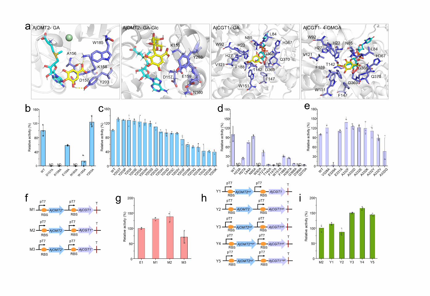 图5.通过半理性设计和密码子优化提高OMT-CGT模块的催化效率