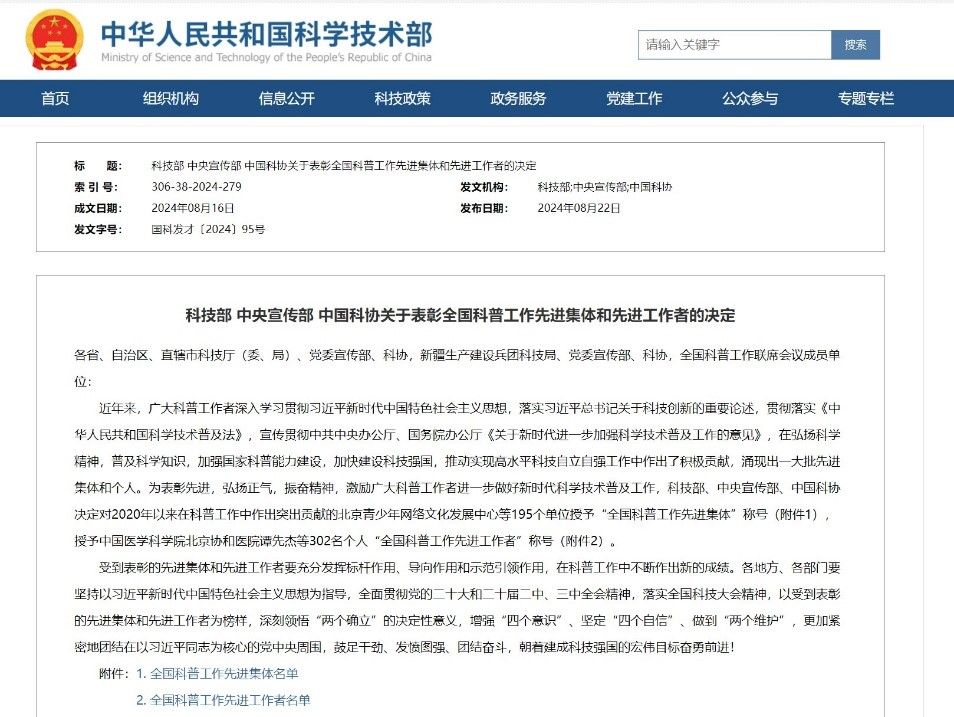 近日,科技部、中央宣传部、中国科协做出关于表彰全国科普先进集体和先进工作者的决定。我校久久小说 石莎教授名列其中,这是石莎教授继2021年获得“全民科学素质工作先进个人”称号后,再次获得的国家级科普荣誉称号。