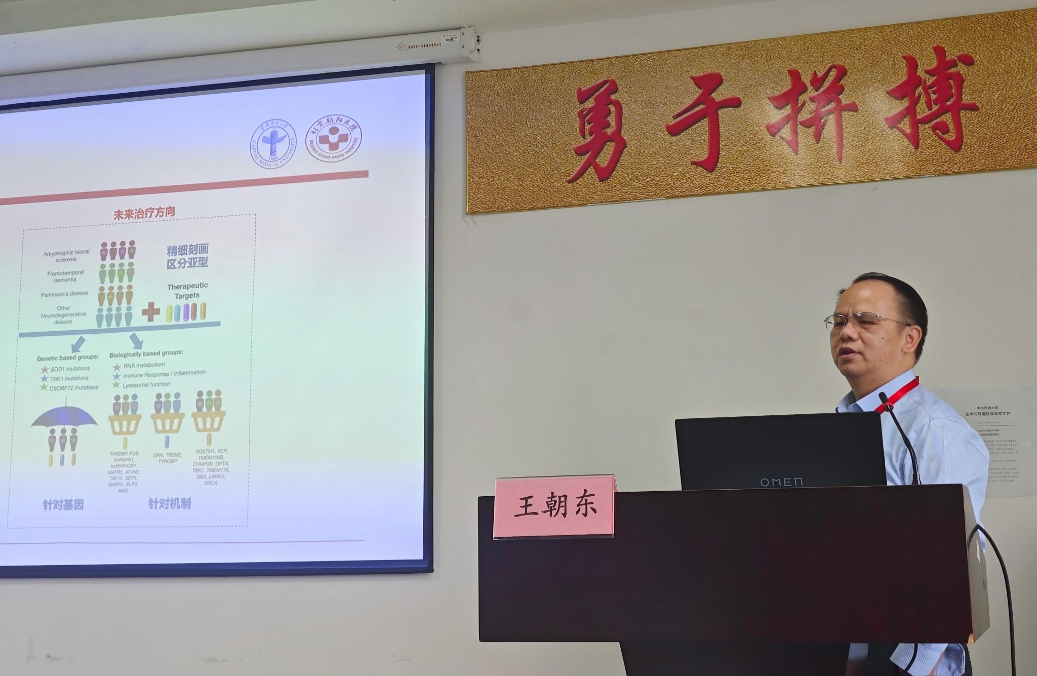 在理工楼1027举办第十期“生环之声”学术大讲堂,邀请首都医科大学附属北京朝阳医院神经内科主任、博士生导师王朝东教授,为学院师生作题为“肌萎缩侧索硬化症(渐冻症)的临床诊断与遗传咨询”的专题学术讲座,由院长张严教授主持。