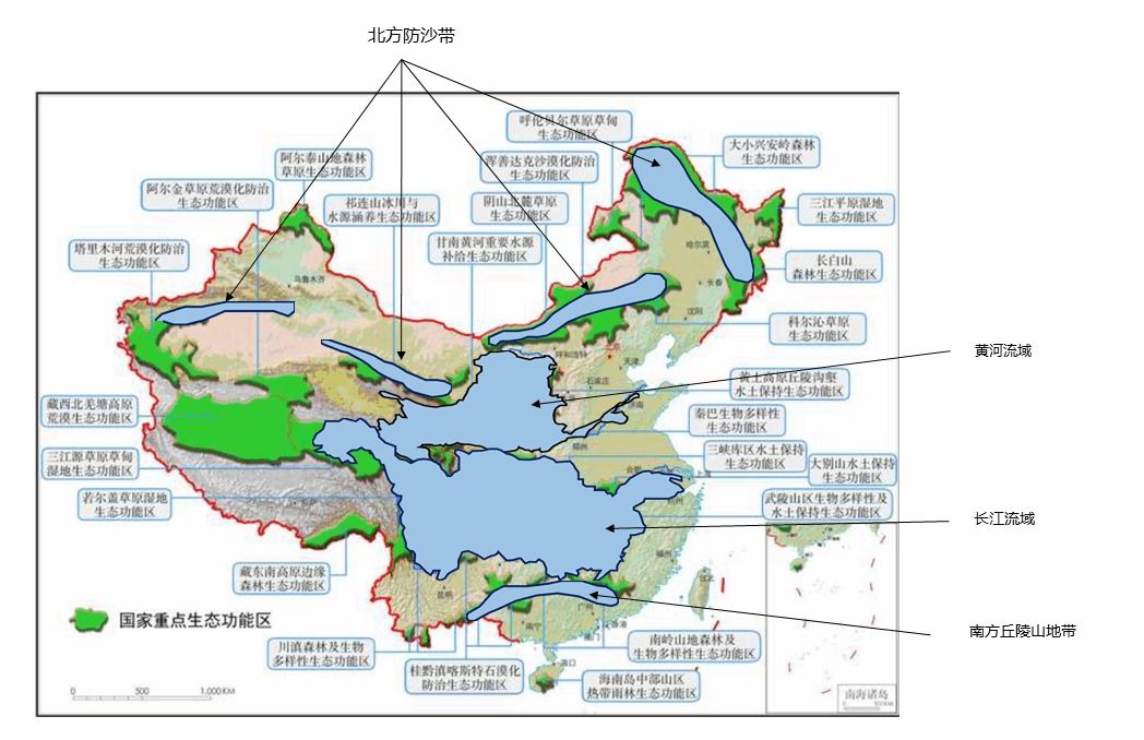 以北方生态屏障带、黄河流域重点生态区、长江流域重点生态区和我国南方低山丘陵地区为研究区,项目范围自西到东-从内陆到沿海横贯我国三大阶梯,从北至南,以“水”为线,基于“水约束” “水承载”和“水环境、水生态”与“山水工程”生态保护修复关联关系,系统研究国家尺度与重点流域山水林田湖草沙要素间生态耦合和稳定性维持机制。
