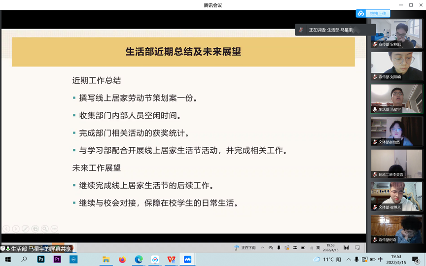 执行主席崔扬发言。他肯定了各部门近期居家工作的成果,希望各成员做好消息的上传下达,完成好工作衔接。此外,他指出同学们居家学习可能会有所懈怠,希望同学们端正学习态度,并且各部门要发挥出引导作用以更好地帮助大家完成居家学习。