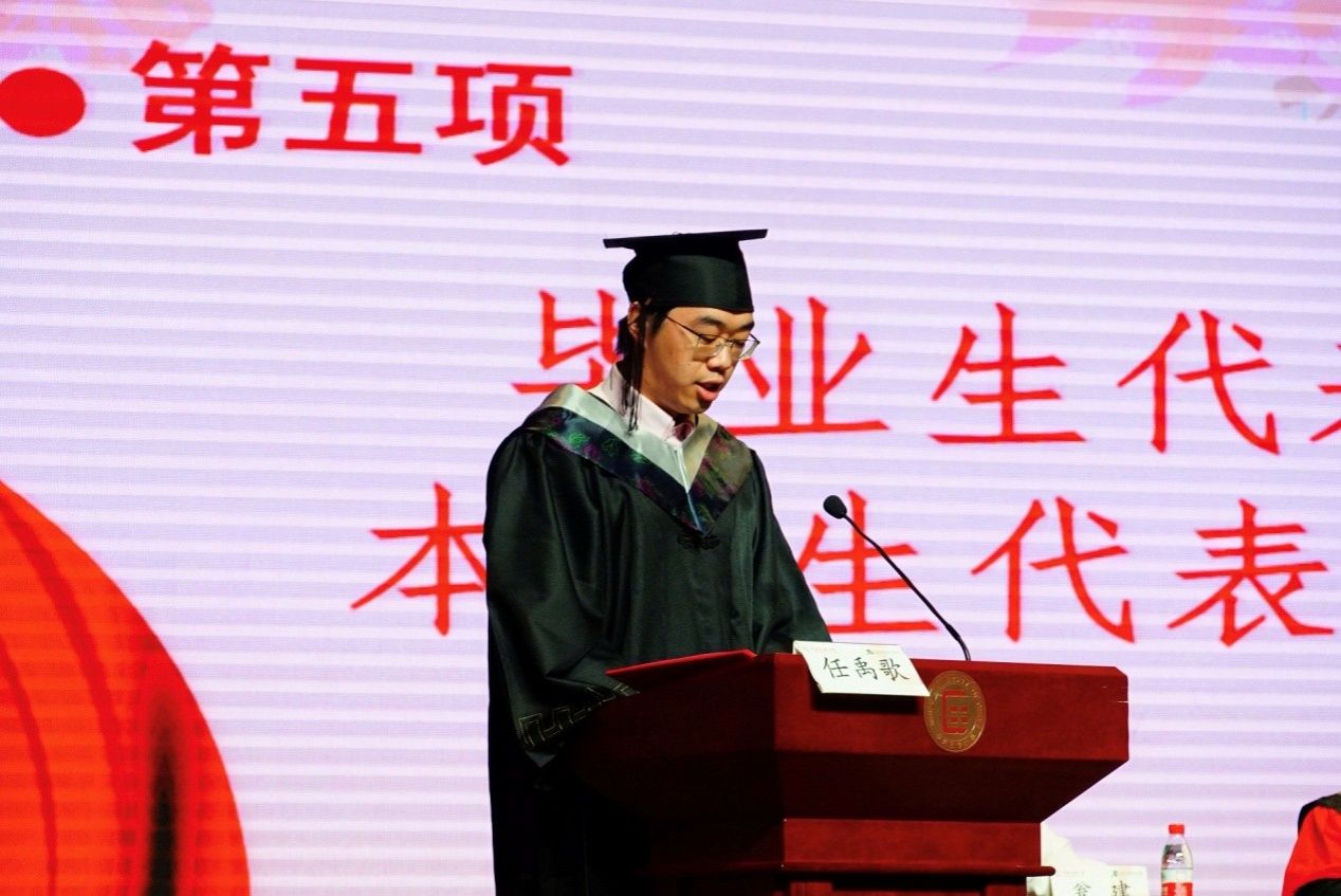 本科毕业生代表,21级环境科学任禹歌同学回顾了四年的学习经历,对母校的培育、师长的教诲、同窗的扶持表达了感激之情。他表示,“美美与共,知行合一”的校训早已融入血脉,“青春如火,超越自我”的生环精神始终激荡心间。在今后的道路上,定当秉持“脚踏实地、敢想敢为”的信念,铭记“团结一心,勇于拼搏”的生环精神,让母校的荣光在各行各业绽放。