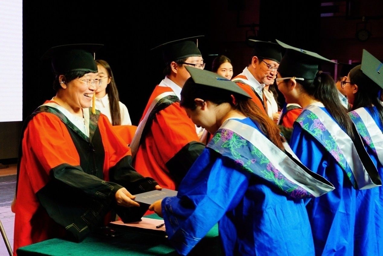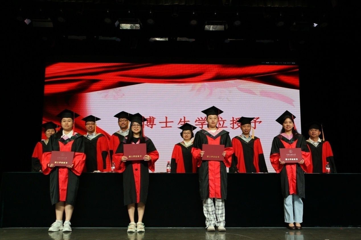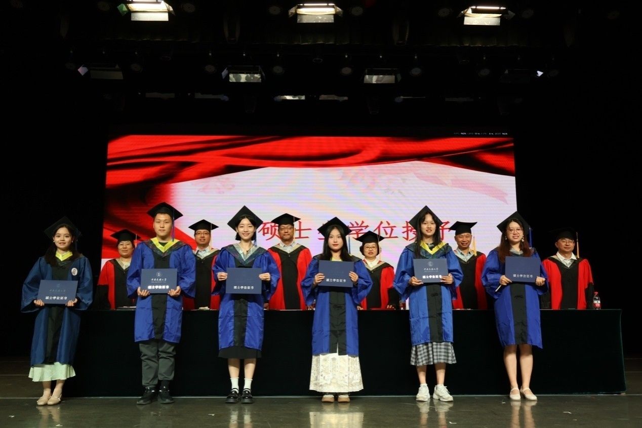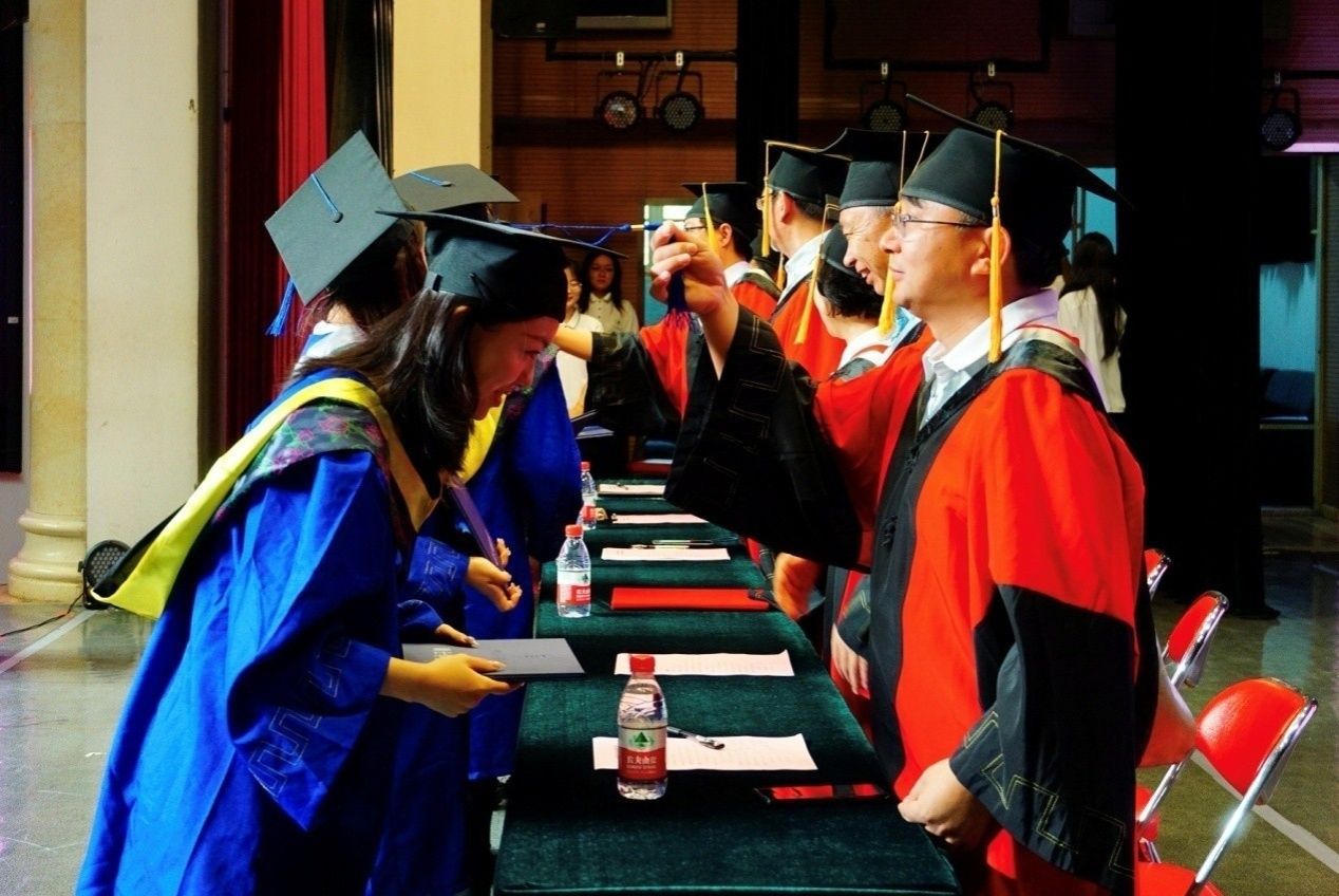 典礼最后,由学院教授代表张严、薛堃、龙春林、林伟立、王晓东、张丽华等为毕业生颁发荣誉证书、拨穗正冠、授予学位证书并合影留念。