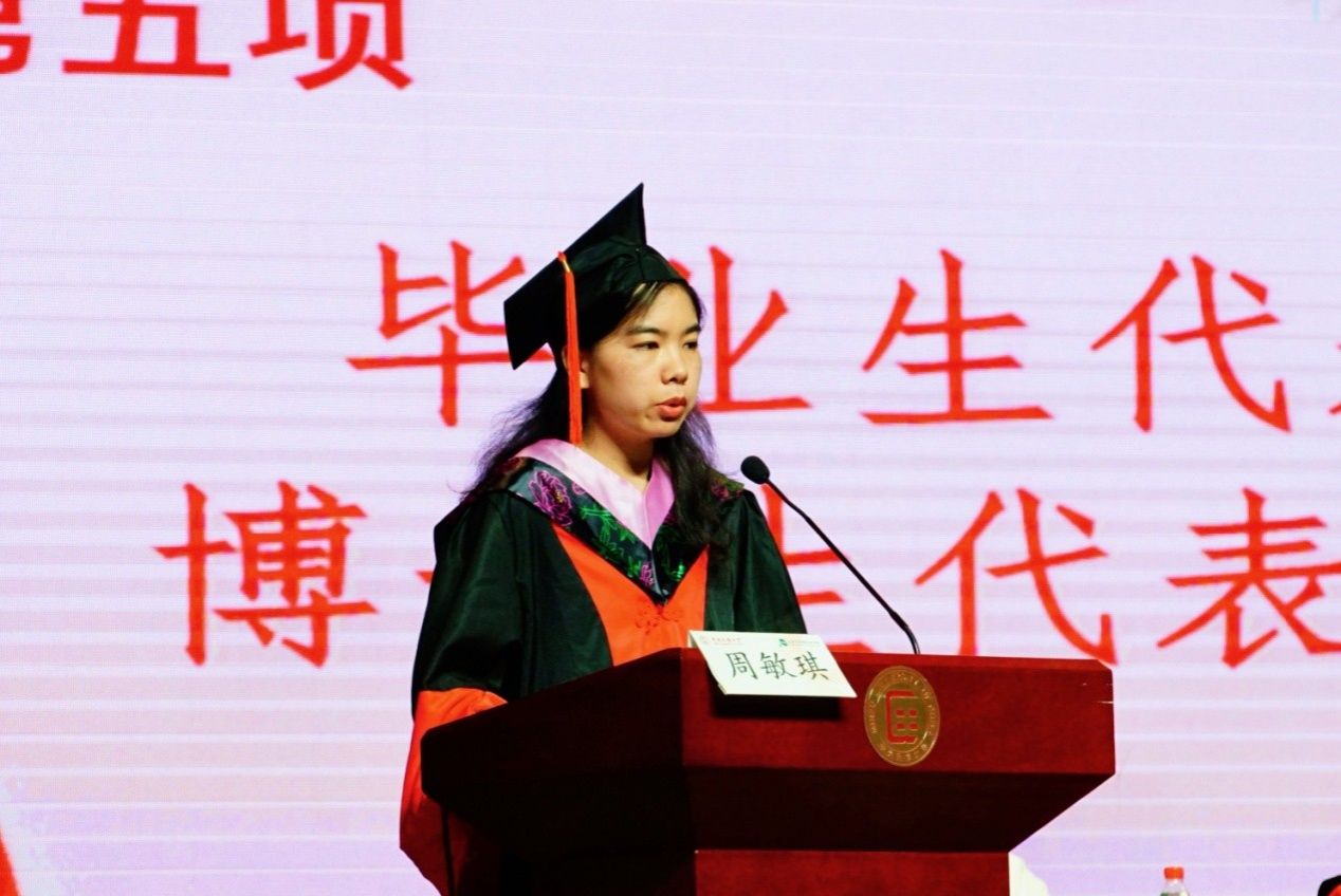 研究生毕业生代表21级生态学博士周敏琪同学首先向全体老师的培养和教诲表达了真挚的感谢。她表示,将时刻牢记中央民族大学包容、务实,以及生环学院坚韧、积极的底色,会和所有毕业生一起,带着民大和生环赋予我们的智慧与责任,将梦想与担当融入工作生活,融入祖国大地。最后,她祝愿各位同学前程似锦,心想事成,祝愿中央民族大学、生环学院欣欣向荣,桃李满天下。