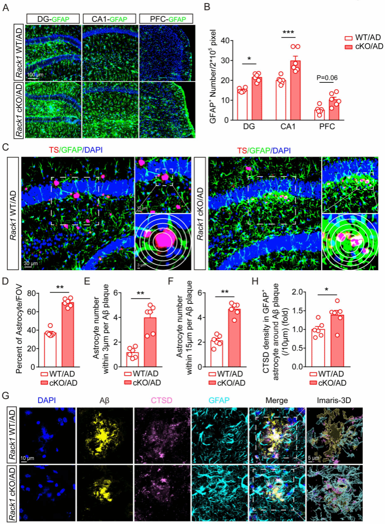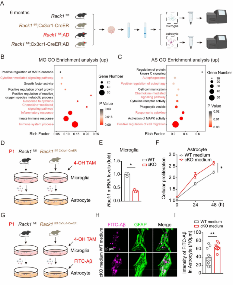 进一步研究发现小胶质细胞Rack1缺失减少了小鼠脑内小胶质细胞的数量,抑制了小胶质细胞对于Aβ的包裹和吞噬能力,但同时增加了星形胶质细胞的增殖和吞噬作用(图3),提示可能通过星形胶质细胞的激活来发挥保护作用。