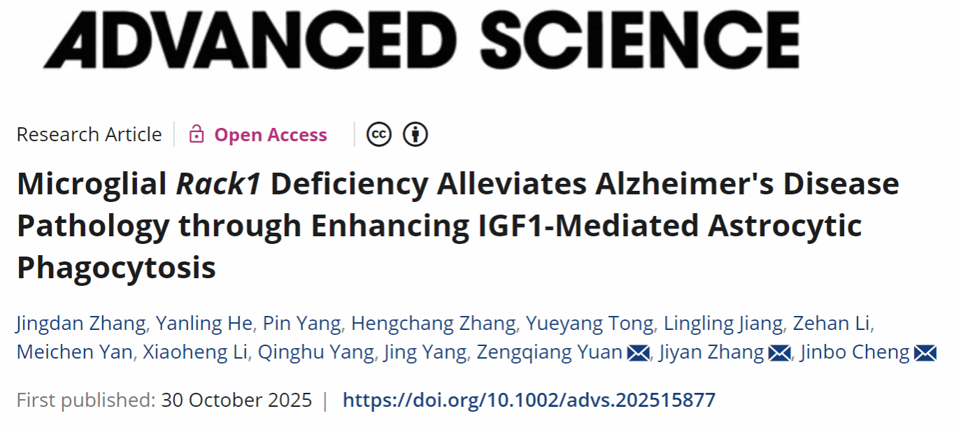 2025年10月30日,程金波教授在阿尔茨海默病致病机制方面取得重要进展,研究成果以“Microglial Rack1 Deficiency Alleviates Alzheimer’s Disease Pathology through Enhancing IGF1-Mediated Astrocytic Phagocytosis”为题发表在国际顶级期刊Advanced Science(中国科学院1区Top,五年影响因子IF=15.6)。