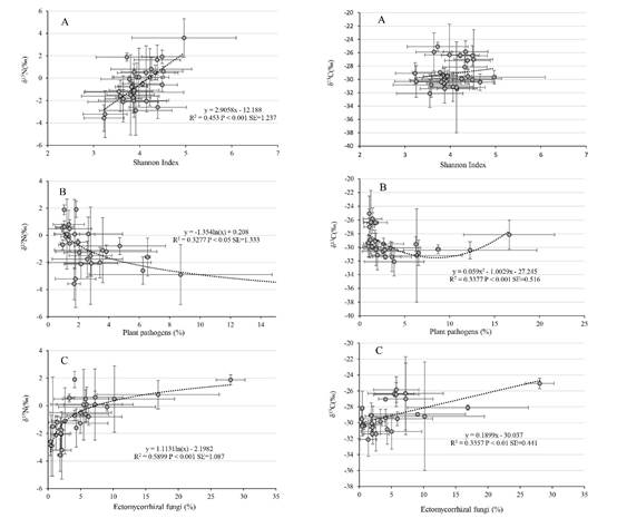 图2.叶片δ15N和δ13C与土壤真菌多样性、外生菌根真菌和植物病原菌丰度的关系