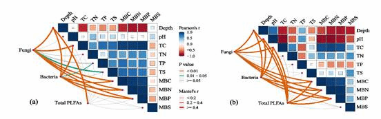 图1.试验田(a)和湿地(b)土壤剖面微生物特性与土壤性质的关系