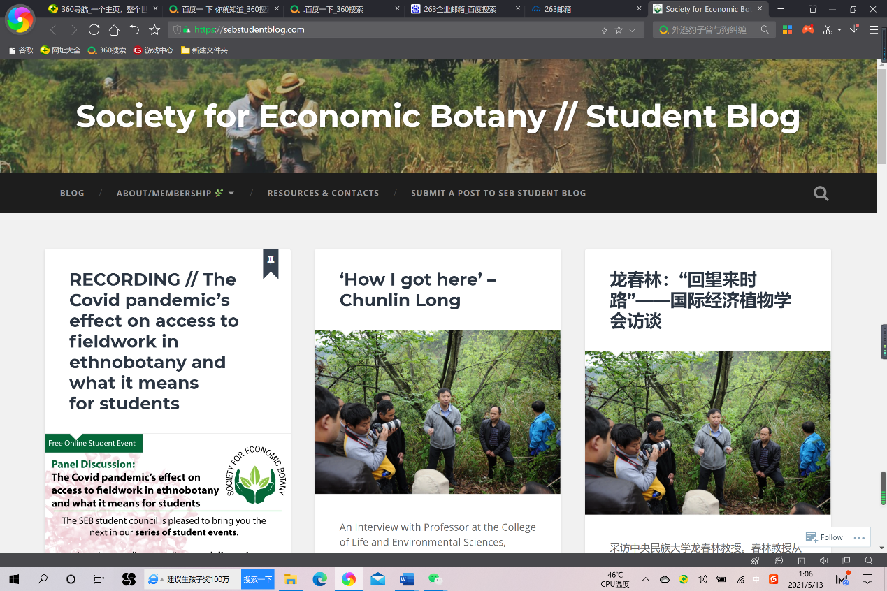 龙春林教授接受了著名国际学术团体Society for Economic Botany(SEB,国际经济植物学会)的专访,并以“龙春林:回望来时路”为题,在其官方网站的学生论坛板块发布(//sebstudentblog.com)。