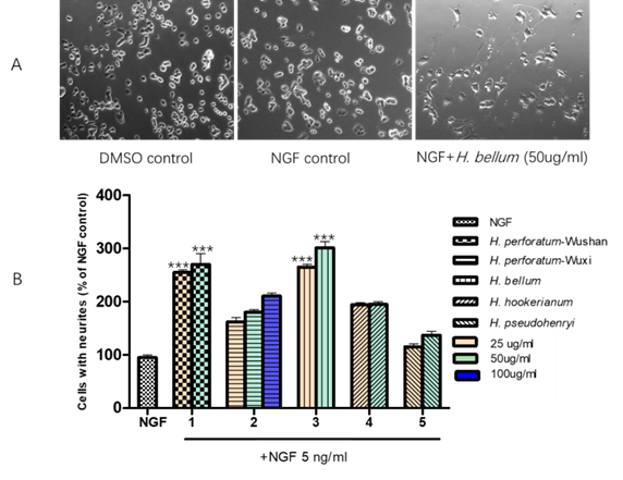 金丝桃属植物挥发油促神经细胞PC12分化活性。(A) PC12细胞形态变化,分别为0.1% DMSO,细胞生长因子NGF (5 ng/ml),和NGF (5 ng/ml) +美丽金丝桃H. bellum(50 mg/ml)处理。(B)神经突生长细胞统计,以与NGF对照组百分比定量。***p < 0.001与NGF组相比。