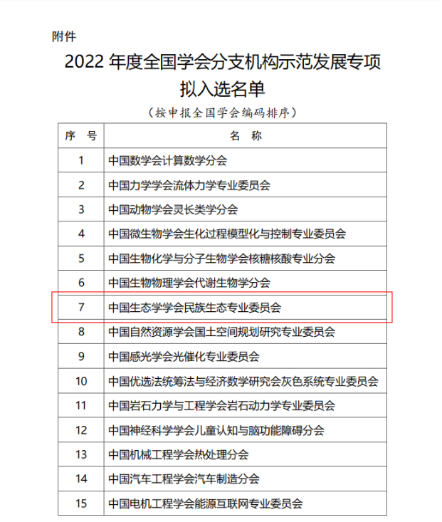 的“中国生态学学会民族生态专业委员会”成功入选“中国科协2022年度全国学会分支机构示范发展专项”,成为2022年度全国学会分支机构示范发展专项择优资助的50个机构之一。该项目由民族生态专业委员会主任冯金朝教授牵头,秘书长石莎教授主持,在学会顾问薛达元教授、副主任委员龙春林教授和生环学院院长周宜君教授的大力支持下申报成功。