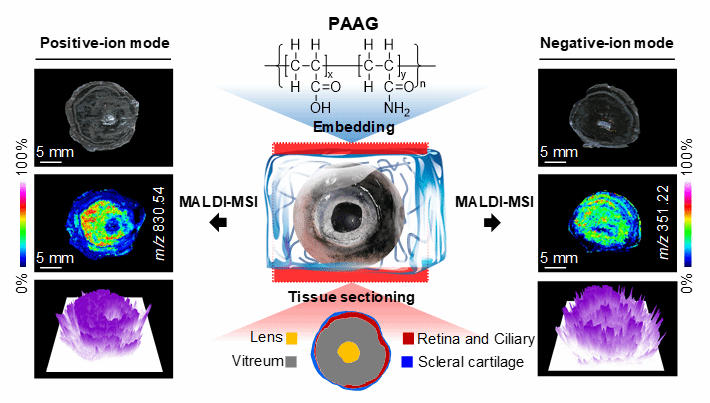 该文研究表明:该包埋剂具有良好的支持和保护效果,稳定的化学性质、低背景离子干扰、温和快速的处理流程等优势,同时适用于脆弱样品组织样本表面多种内源性代谢分子和脂质的正离子及负离子模式检测及成像表征。研究发现,该包埋剂不仅适用于小鼠肝组织表面多种内源性小分子和脂质的原位表征,且对于鱼眼这一典型脆弱动物组织也具有较好的适用性。该新型包埋剂的发现为进一步拓展了MALDI-MSI在脆弱组织的代谢及脂质组学研究领域中的应用提供了一定的技术支持。该项研究是在开发出一种利用MALDI-MSI在非导电玻片上实现FFPE组织切片蛋白原位检测和成像的新方法(CAT-RSGS)(Chemical Communications, 2021, 57(82), 10707-10710)、新型甲醇洗涤策略用以增强动植物组织蛋白质MADI-MSI原位表征性能(Analyst, 2023, 48(4), 823-831)后的又一重要进展。