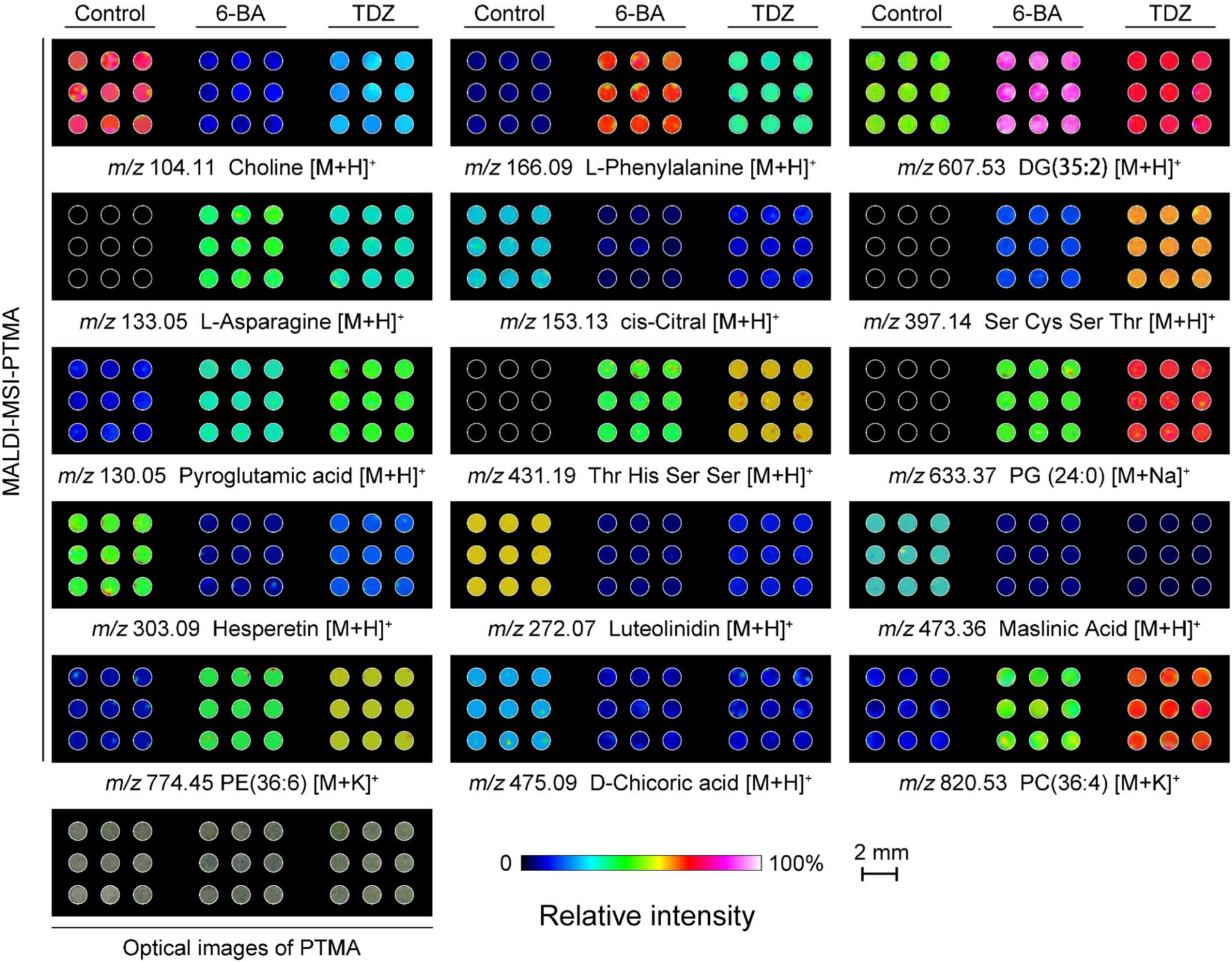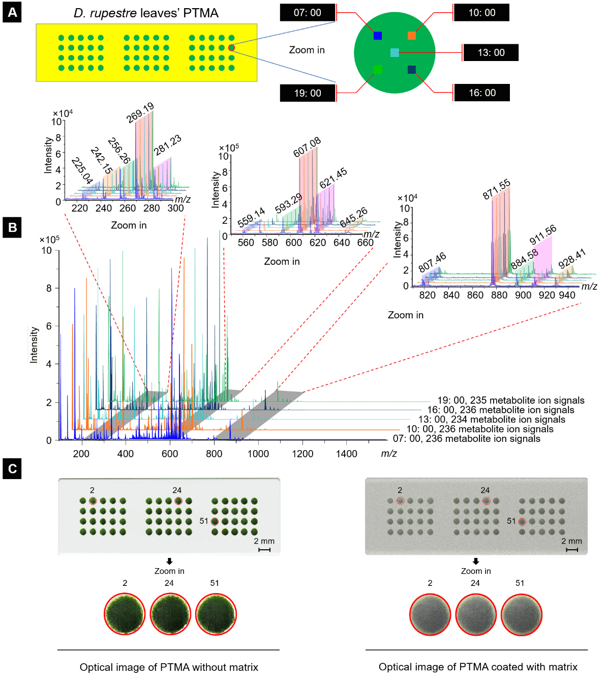 研究团队利用明胶分子成功制备了植物组织微阵列模具 (PTMA)。将选取的植物组织样本进行充分匀浆处理后即可获得包含植物组织内部全部代谢分子匀浆液;随后在低温条件下立即将组织匀浆液小心注入PTMA明胶模具中并放置于冷冻切片机内冷却,待其充分冷冻凝固后即可进行高质量冰冻切片;将植物组织微阵列切片融裱至ITO导电玻片上,待其干燥后利用基质喷涂装置进行基质包被,随后利用MALDI-MS仪即可进行植物组织代谢分子质谱高效检测与成像分析。