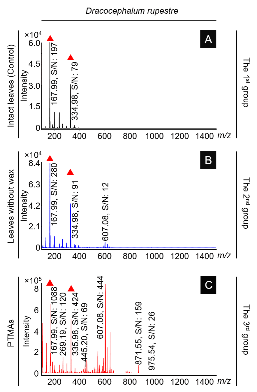 三种岩青兰叶片组织 (完整、去除表皮蜡质、匀浆PTMA) MALDI-MS检测性能比较