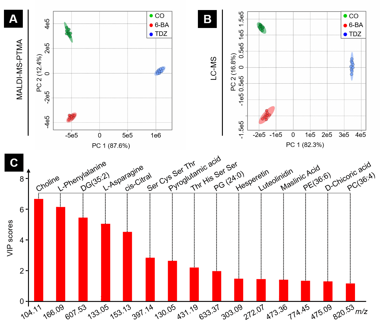 MALDI-MSI-PTMA和LC-MS对于三种不同处理岩青兰叶片代谢分子检测结果分析
