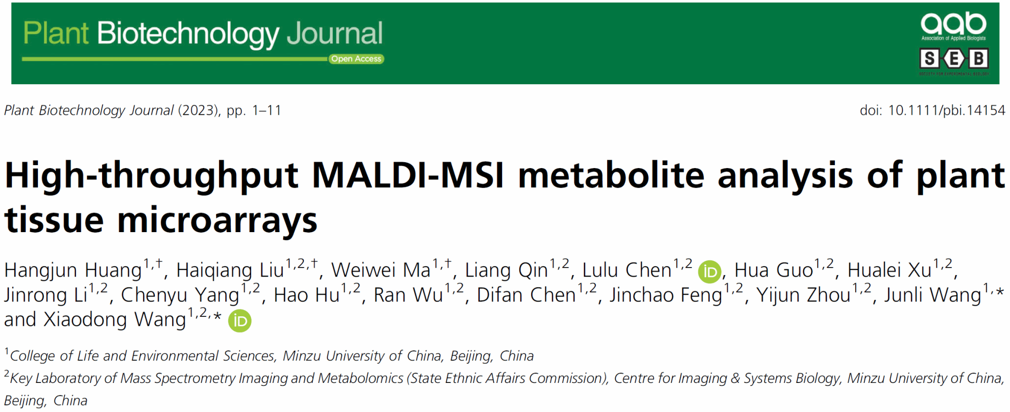 近日,中央民族大学生命王晓东教授团队在植物学知名期刊《Plant Biotechnology Journal》(SCI影响因子13.8) 在线发表题为"High-throughput MALDI-MSI metabolite analysis of plant tissue microarrays”的研究论文。该研究开发了一种新型代谢组学分析技术,名为:基于植物组织微阵列的基质辅助激光解吸/电离质谱成像技术(MALDI-MSI-PTMA),并成功将其应用于植物组织内源性代谢分子高通量检测与成像表征。MALDI-MSI-PTMA不仅完全克服了由于植物组织特殊结构 (如表皮蜡质、角质、细胞壁) 的限制而无法高效检测内部代谢分子的缺点,而且该技术操作简单无需提取、分离、富集等多步样本前处理过程,完全避免了内源性分子不必要的损失;此外,结合该技术高通量性的优势特点,MALDI-MSI-PTMA的应用极大地增强了植物代谢分子的整体检测性能与可视化成像表征能力。研究表明MALDI-MSI-PTMA有潜力成为植物科学代谢组学研究中一种强有力的高通量分析技术。