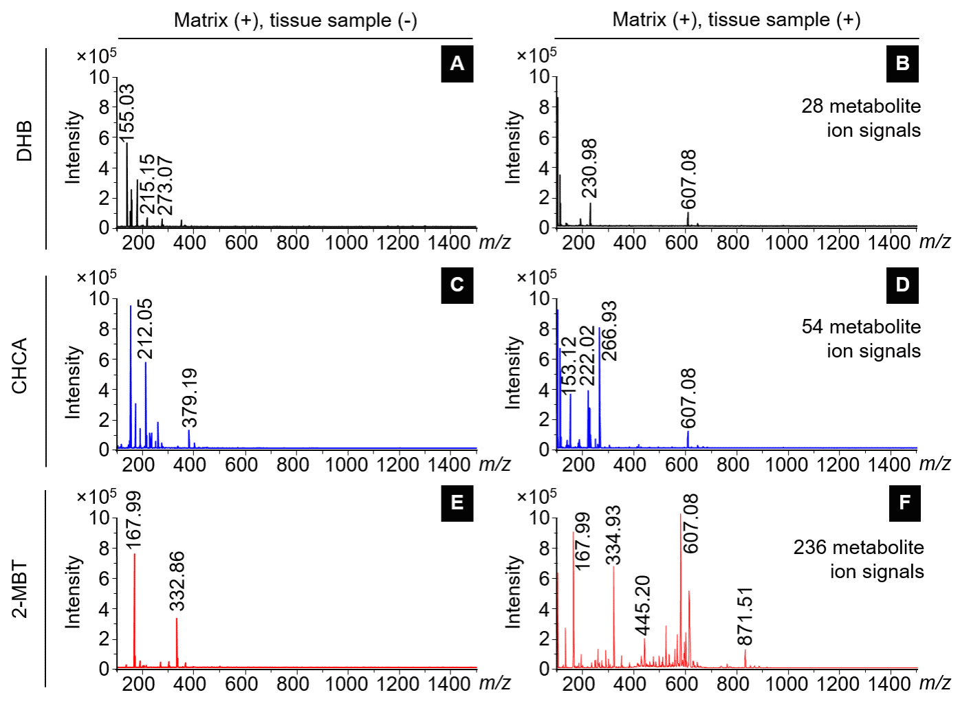 三种MALDI基质DHB、CHCA、2-MBT对岩青兰叶片组织代谢分子检测性能比较