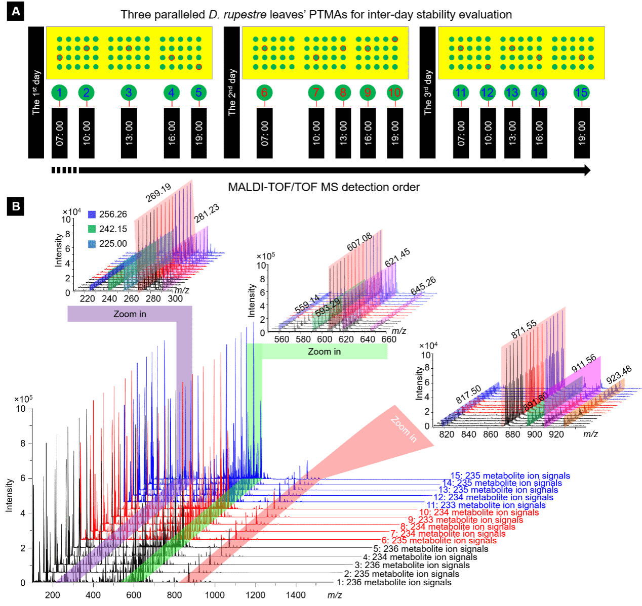 该研究首先评估了DHB、CHCA、2-MBT三种MALDI基质对岩青兰叶片组织的检测性能,结果发现2-MBT基质具有最少的背景峰干扰和最佳的代谢分子离子信号检测性能。因此选定2-MBT作为后续MALDI-MSI检测和成像基质。接着,研究团队比较了MALDI-MS对完整的岩青兰叶片组织、去除表皮蜡质岩青兰叶片组织、匀浆后注入PTMA模具岩青兰叶片组织代谢分子的检测性能,结果表明PTMA制备的组织切片MALDI-MS检测效能最佳。此外,研究团队随机选择了15种代谢分子离子信号 (包括:m/z 225.04, 242.15, 256.26, 269.19, 281.23, 559.14, 593.29, 607.08, 621.45, 645.26, 807.46, 871.55, 884.58, 911.56, 928.41) 对PTMA切片进行了MALDI-MS检测日内和日间稳定性评估,结果显示PTMA切片15种代谢分子离子信号强度均具有较好的日内、日间稳定性与重现性。